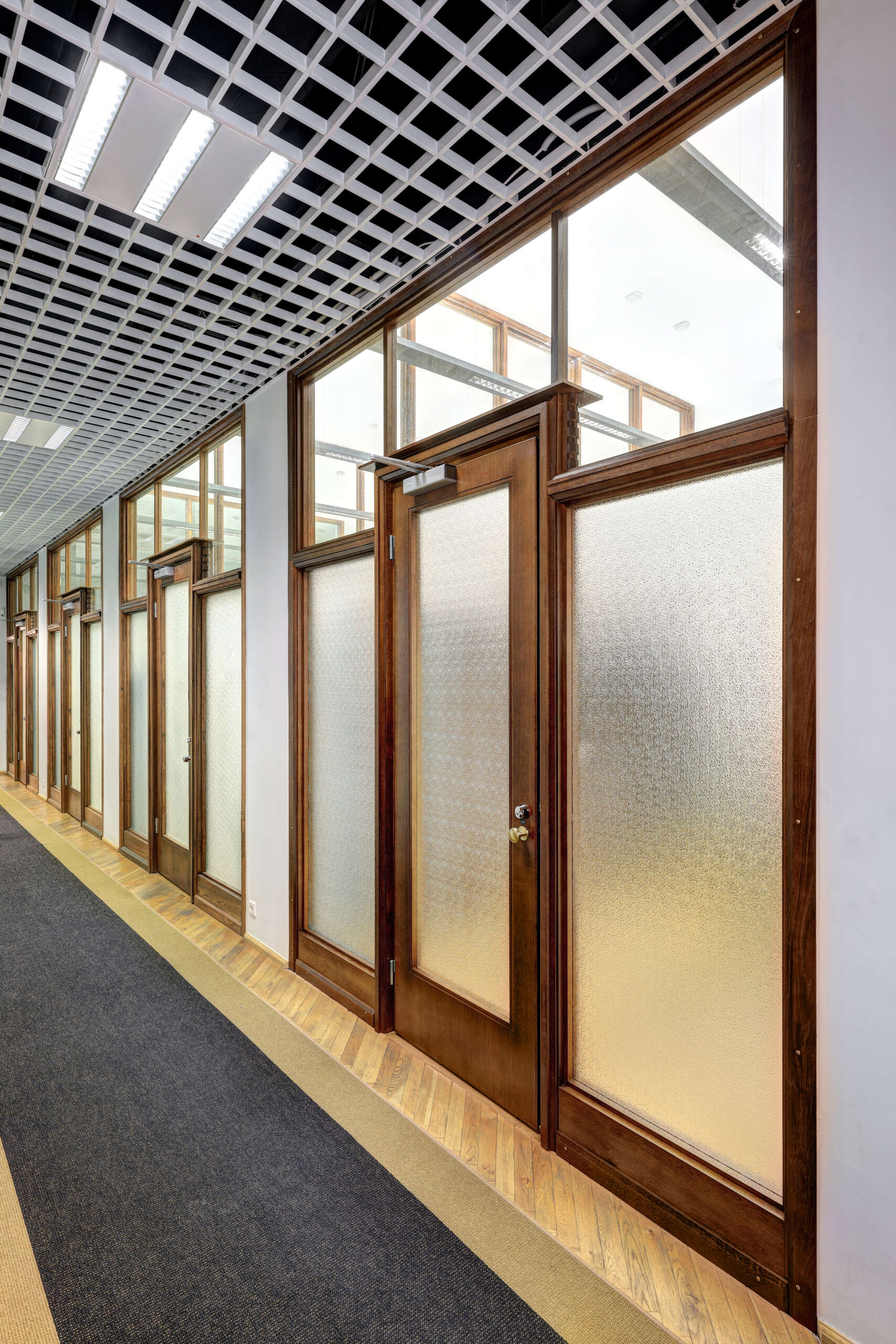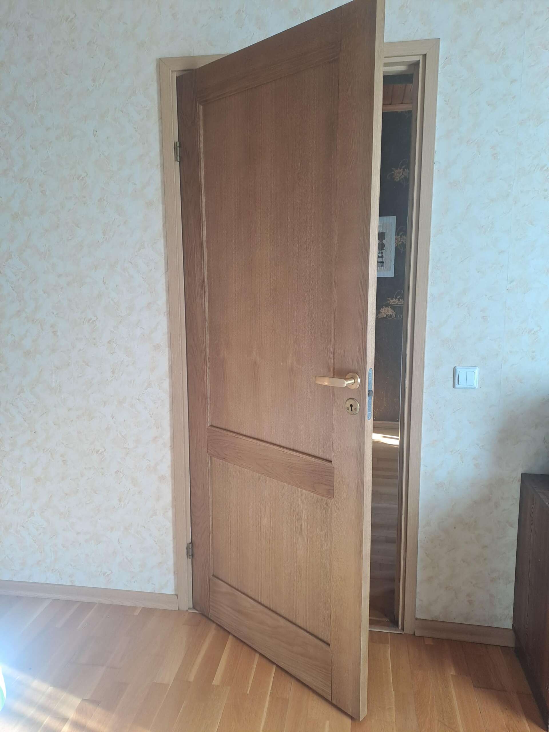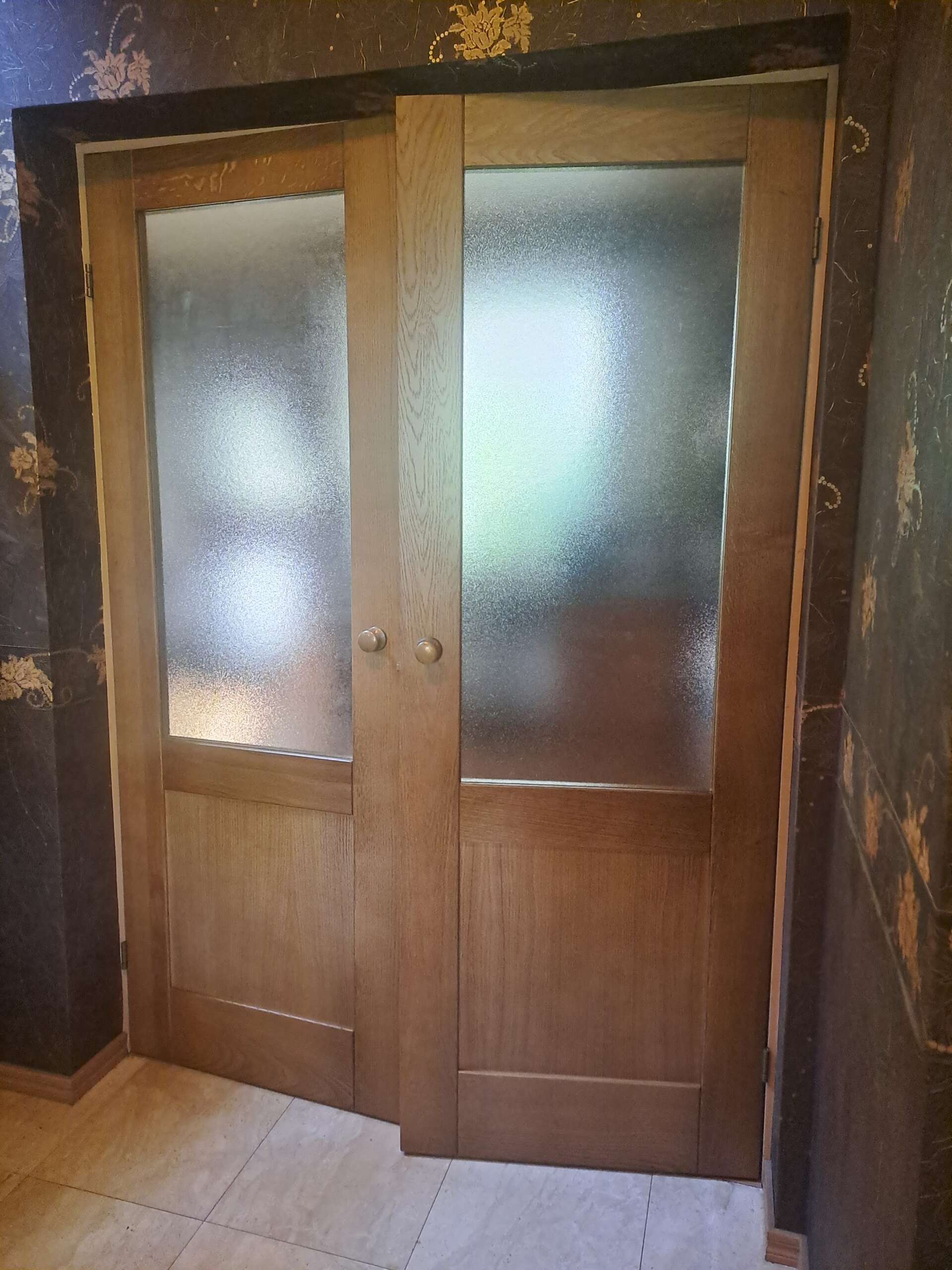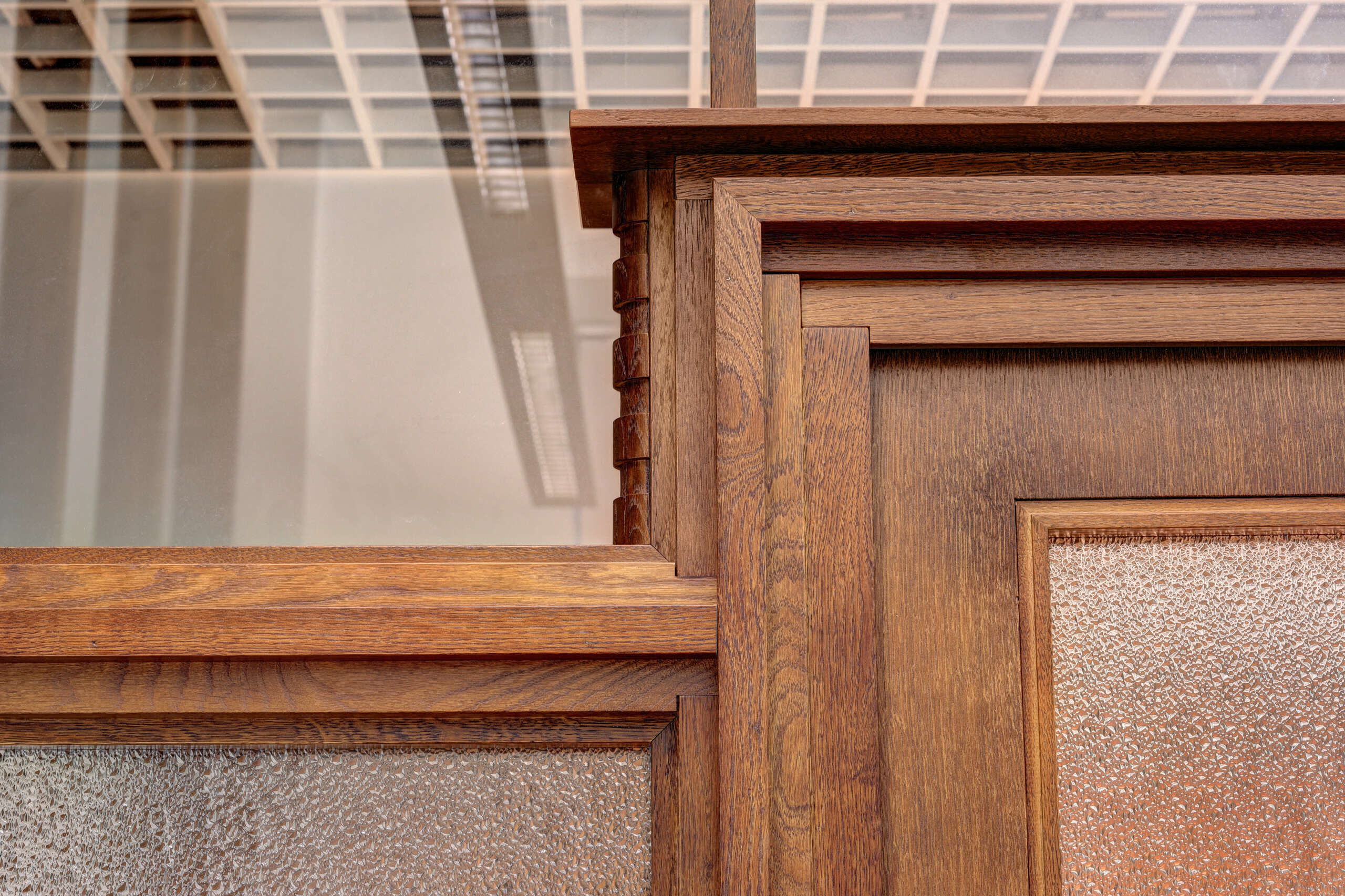 Eesti Panga hoones on erinevate ajastute uksi. Paljudele neist on lisatud esindushoonele kohaselt ilusaid ja huvitavaid detaile. Meie meistritel õnnestus teha üks põnev klaasidega kontori uks. Uks ,seda ümbritsevad raamid ja dekoratiivsed detailid on valmistatud tamme puidust. Peits ja lakk viimistlusena aitavad esile tuua meie rahvuspuu ilusa tekstuuri.